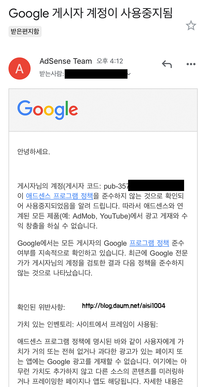 그래서 애드몹 들어가지지 않고 애드센스 들어가면 정지되었다고 나옵니다.